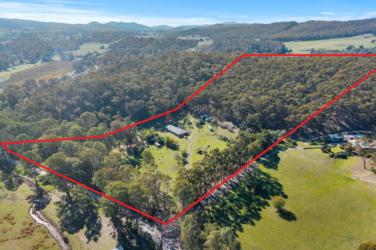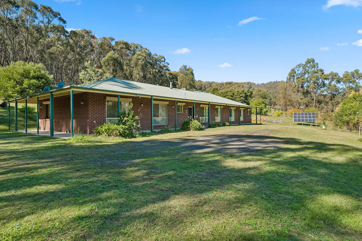 Set in the heart of Victoria's renowned King Valley food and wine region, just minutes from the charming townships of Whitfield and Cheshunt, this exceptional lifestyle property offers privacy, resilience, and self-sufficiency on approximately 15.5 acres. Including around 9 acres of natural bushland providing a serene, low-maintenance backdrop and added seclusionTucked away from the main road and set back around 100 metres, the residence enjoys a peaceful, elevated position on the hillside, naturally protected from wind, fire approach, and flooding. The substantial home spans approximately 260sqm and features 9-foot ceilings, generous proportions, and a thoughtfully designed layout suited to both family living and potential dual accommodation.