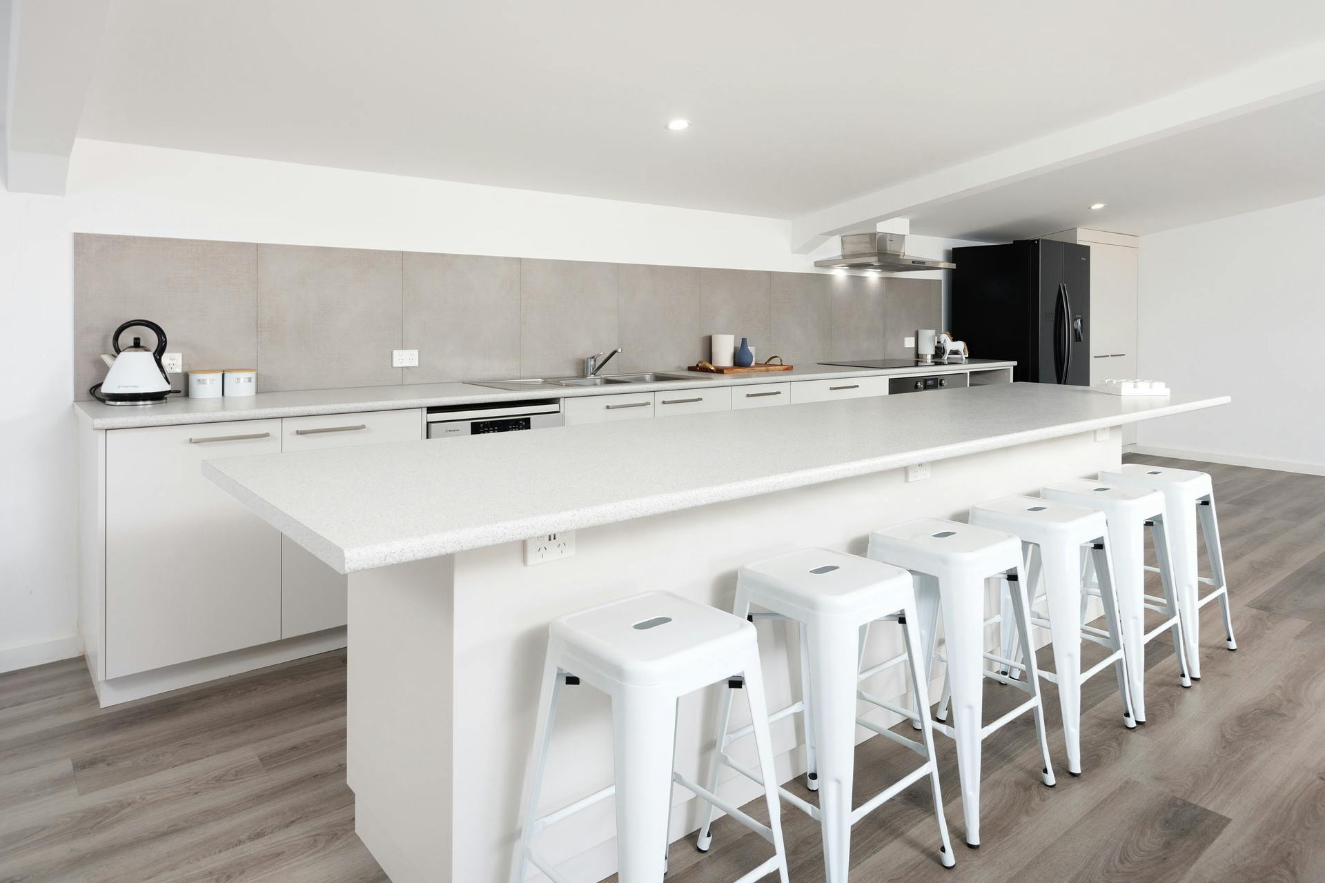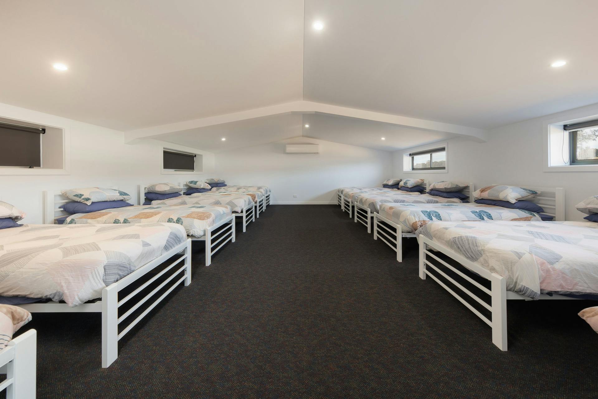 - Dormitory (12 beds), open-plan kitchen/living, arena views