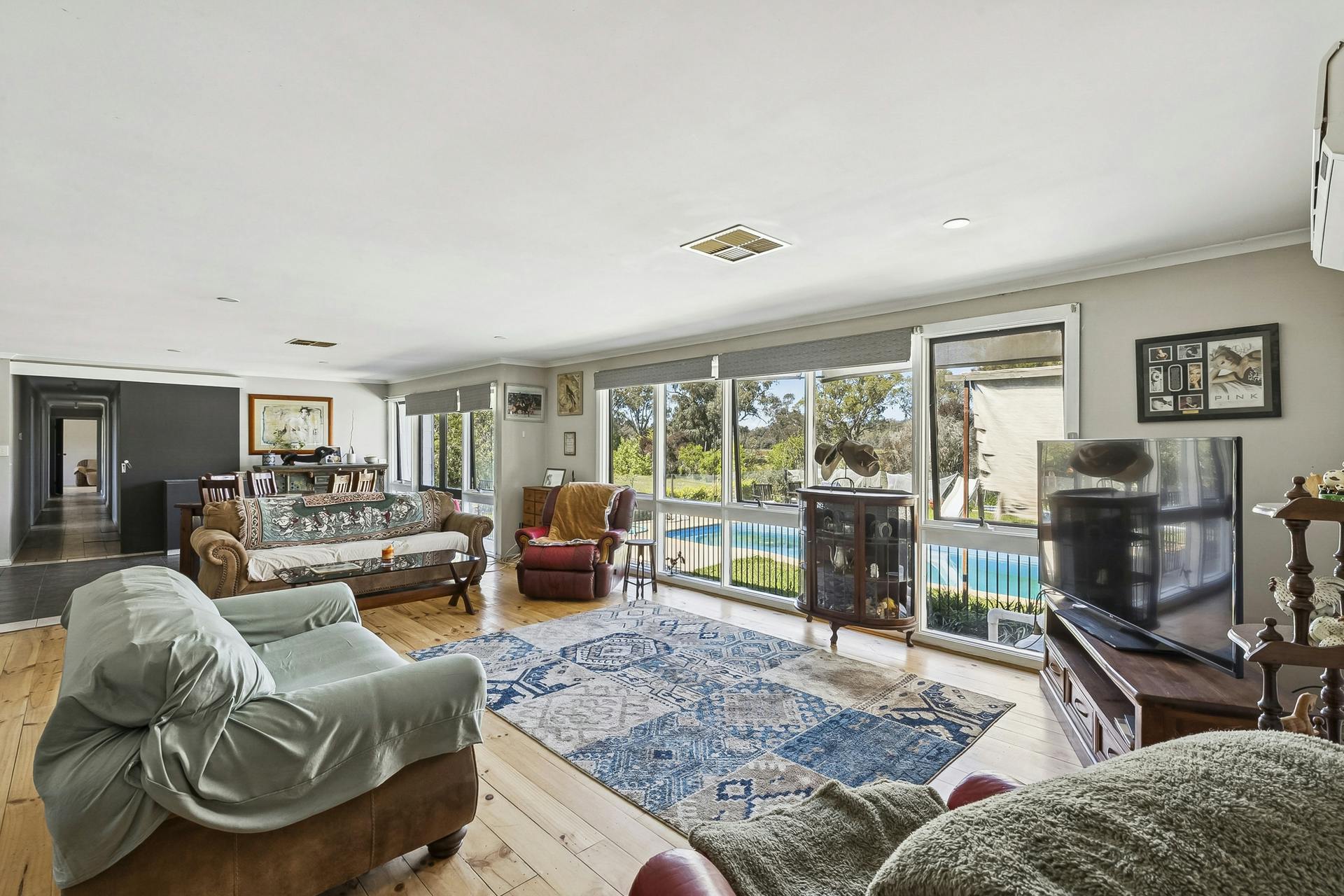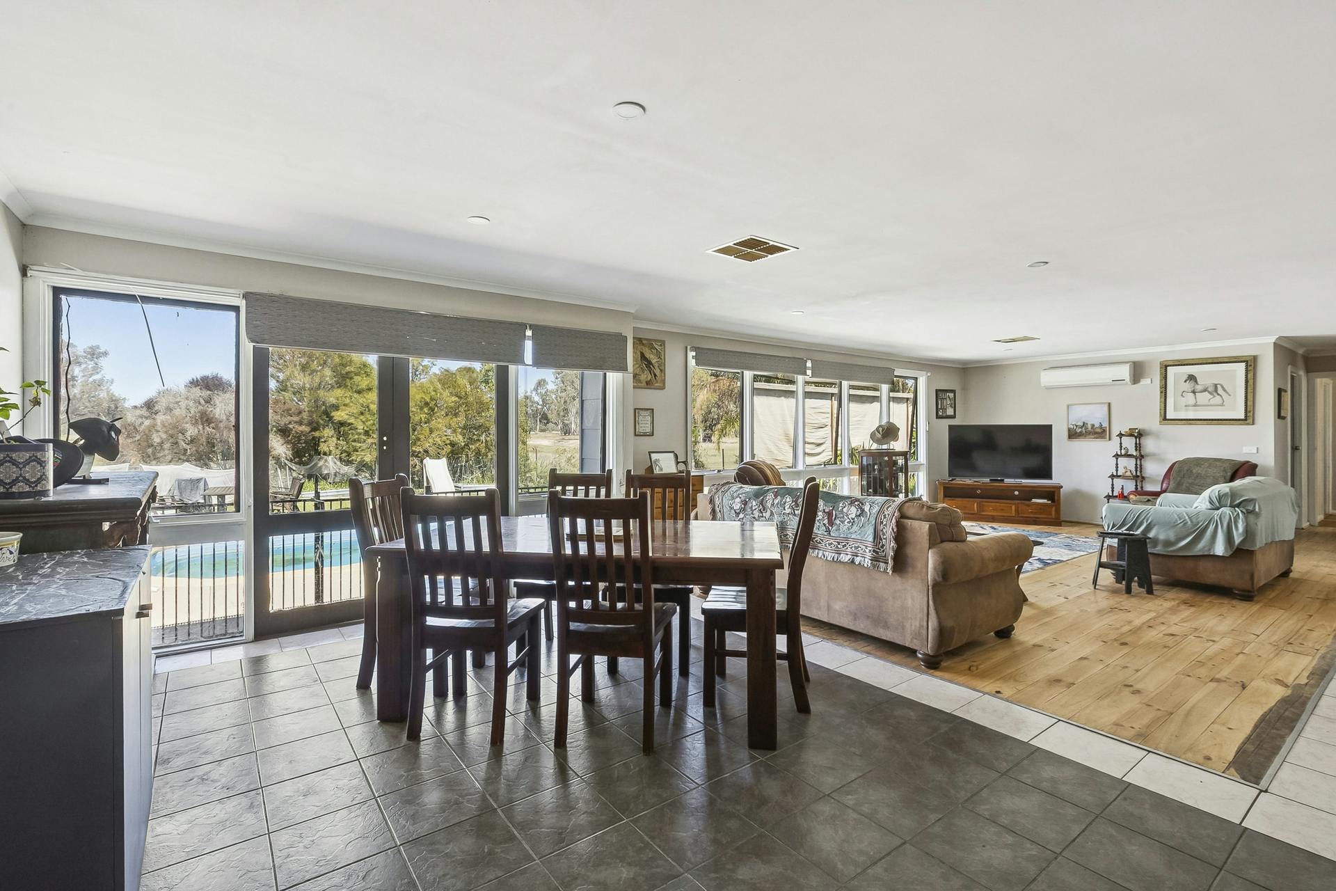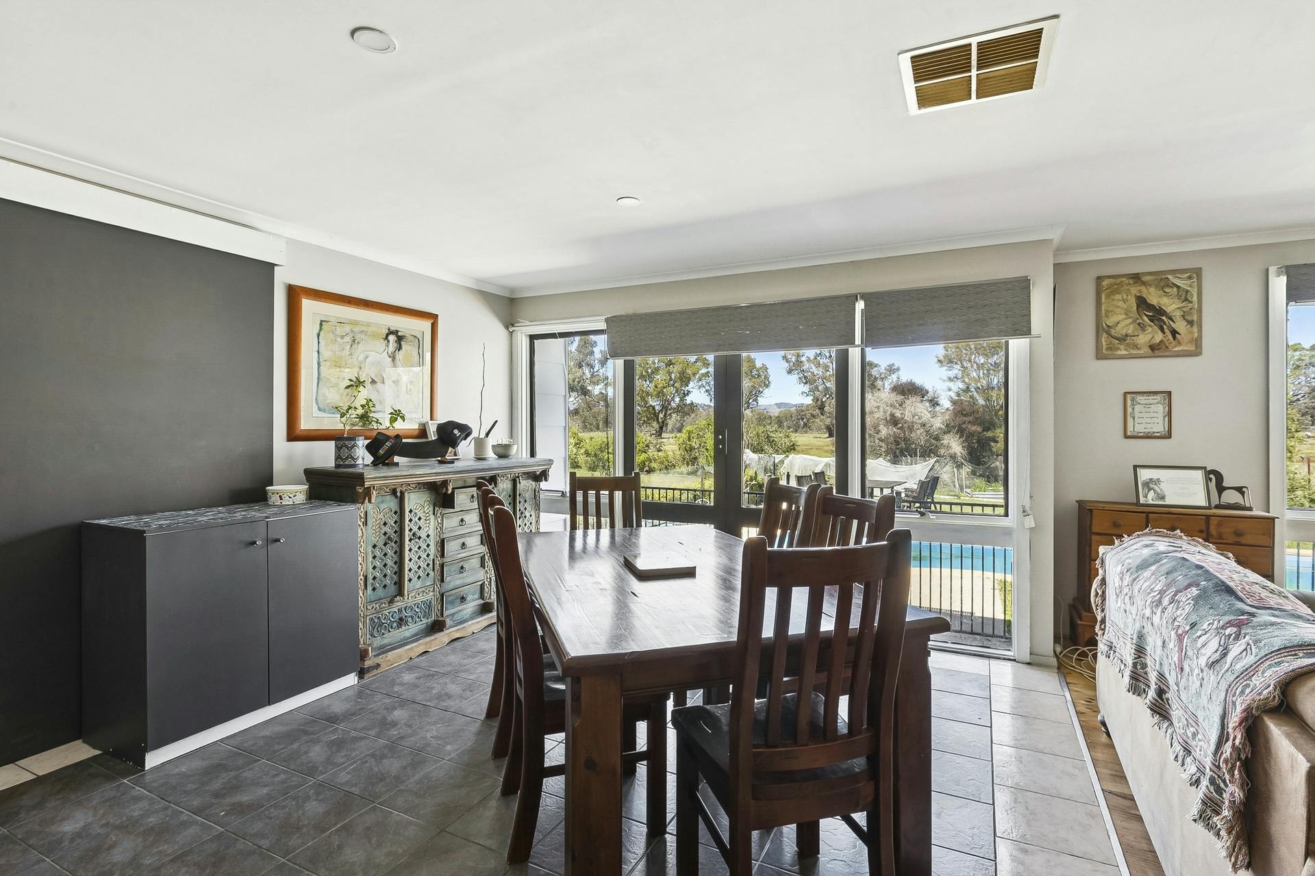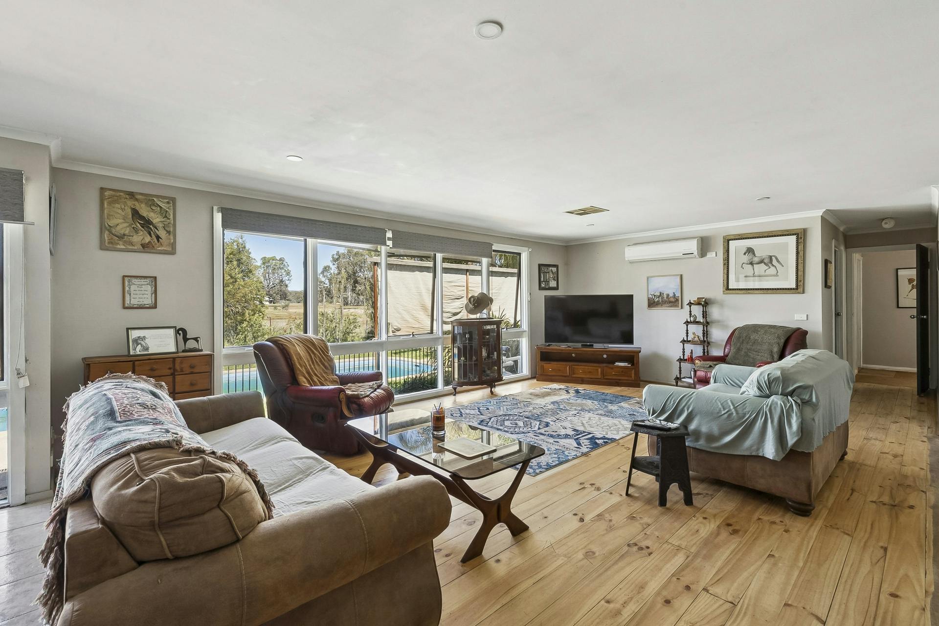 Designed for horse enthusiasts, the property includes a 43m deep bore with reticulated water to all fenced horse paddocks, a dressage arena and electric fencing. Additional lifestyle improvements include a solar-heated swimming pool, large bird aviary, chook runs and extensive lawns, allowing for hobby farming, animals and outdoor enjoyment.
